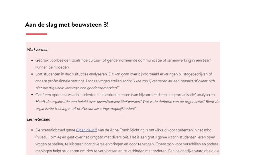 Geef een opdracht waarin studenten beleidsdocumenten (van bijvoorbeeld een stageorganisatie) analyseren. Heeft de organisatie een beleid over diversiteitsensitief werken? Wat is de definitie van de organisatie? Biedt de organisatie trainingen of professionaliseringsmogelijkheden?