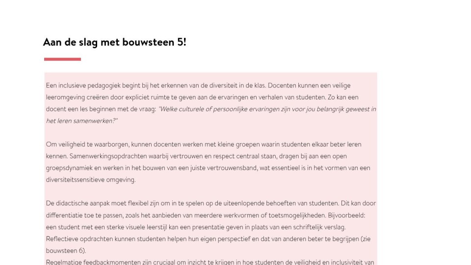 Een inclusieve pedagogiek begint bij het erkennen van de diversiteit in de klas. Docenten kunnen een veilige leeromgeving creëren door expliciet ruimte te geven aan de ervaringen en verhalen van studenten. Zo kan een docent een les beginnen met de vraag: "Welke culturele of persoonlijke ervaringen zijn voor jou belangrijk geweest in het leren samenwerken?"