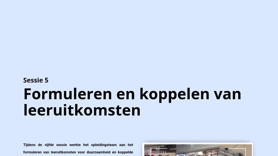 Tijdens de vijfde sessie werkte het opleidingsteam aan het formuleren van leeruitkomsten voor duurzaamheid en koppelde deze aan het curriculum.