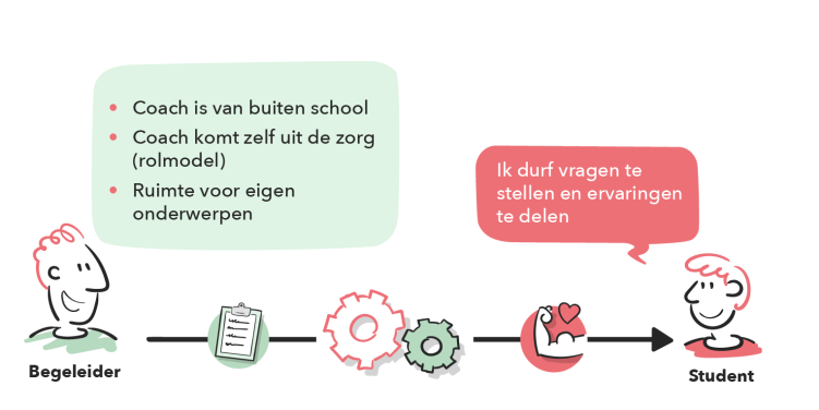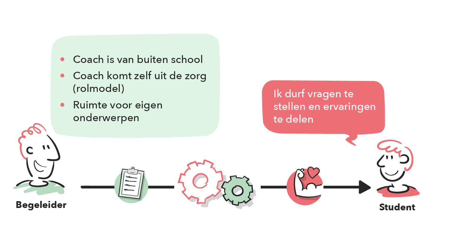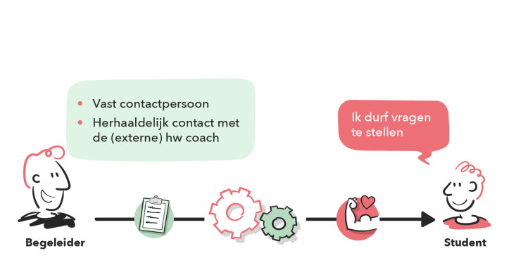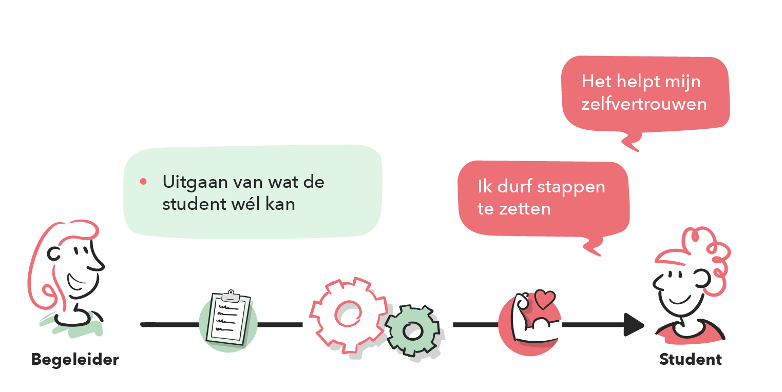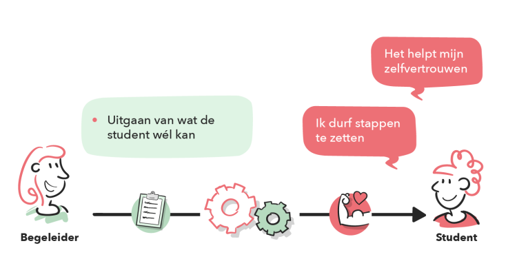 In de gesprekken met de arbeidscoach heeft de student ruimte om eigen onderwerpen te bespreken. De focus ligt op het opbouwen van een vertrouwensband, o.a. door informele ontmoetingen en het inzetten van laagdrempelige communicatiekanalen zoals WhatsApp. De arbeidscoach zorgt dat hij/zij zichtbaar en benaderbaar is. Dit samen verlaagt de drempel voor studenten om hulp te zoeken en om zorgen te uiten en vragen te stellen. Daarnaast wordt het gevoel van verbondenheid en vertrouwen versterkt. Doordat studenten hulp durven te vragen, stimuleert dat de ontwikkeling van persoonlijke en professionele vaardigheden en om zelfverzekerder om te gaan met tegenslagen.