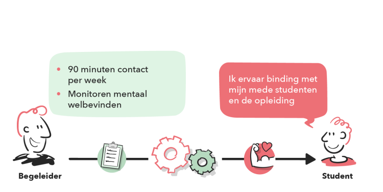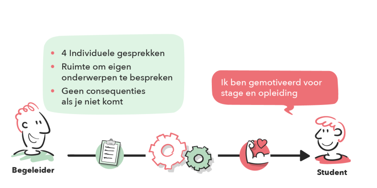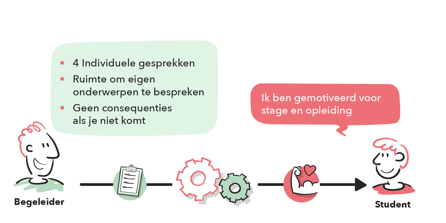 Bij deze aanpak is de begeleiding laagdrempelig en flexibel ingestoken. Het is aan studenten zelf om individuele coachingsgesprekken te voeren, er geldt hiervoor geen aanwezigheidsplicht en er zijn ook geen consequenties aan verbonden. Studenten hebben ook de ruimte om eigen onderwerpen te bespreken, ervaringen te delen en situaties aan te dragen om te bespreken. Doordat studenten vrij zijn om hierin keuzes te maken, worden ze gestimuleerd om verantwoordelijkheid te nemen voor de eigen ontwikkeling. Dit helpt om studenten vanuit hun innerlijke drijfveren te motiveren.