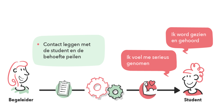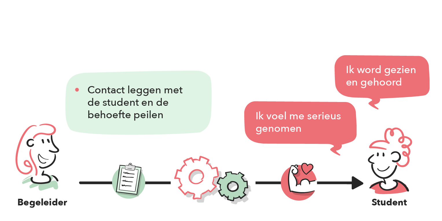 Proactieve houding. Leg actief contact en peil de individuele behoefte van de student. Start vanuit de vraag van de student en onderzoek waar ondersteuning gewenst is.