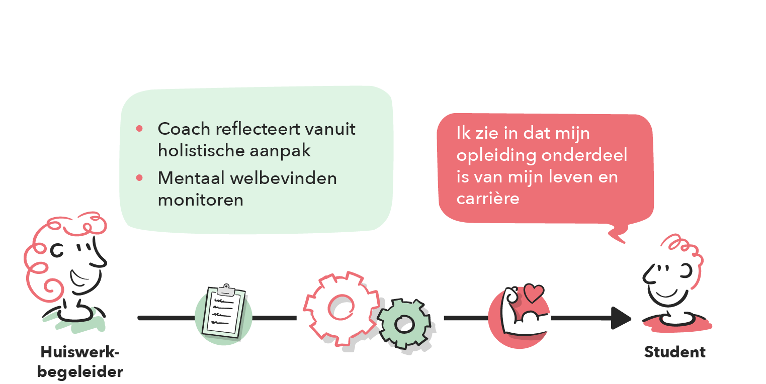 De externe huiswerkbegeleider houdt individuele reflectiegesprekken met de studenten waarin studenten persoonlijke problemen kunnen aankaarten en de huiswerkbegeleider op een holistische manier met de student reflecteert, waardoor er naar de gehele situatie van de student wordt gekeken en er ook eventuele zorgen of problemen naar voren komen die niet direct met de opleiding te maken hadden. De huiswerkbegeleiding is breed ingestoken en kan inhoudelijke begeleiding omvatten, maar ook leren leren, plannen en omgaan met motivatie en stress. Doordat student zijn/haar wensen en behoeften leert kennen en door de externe begeleiding, leert de student inzien dat de opleiding een onderdeel is van hun professionele en persoonlijke ontwikkeling.