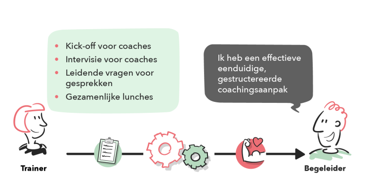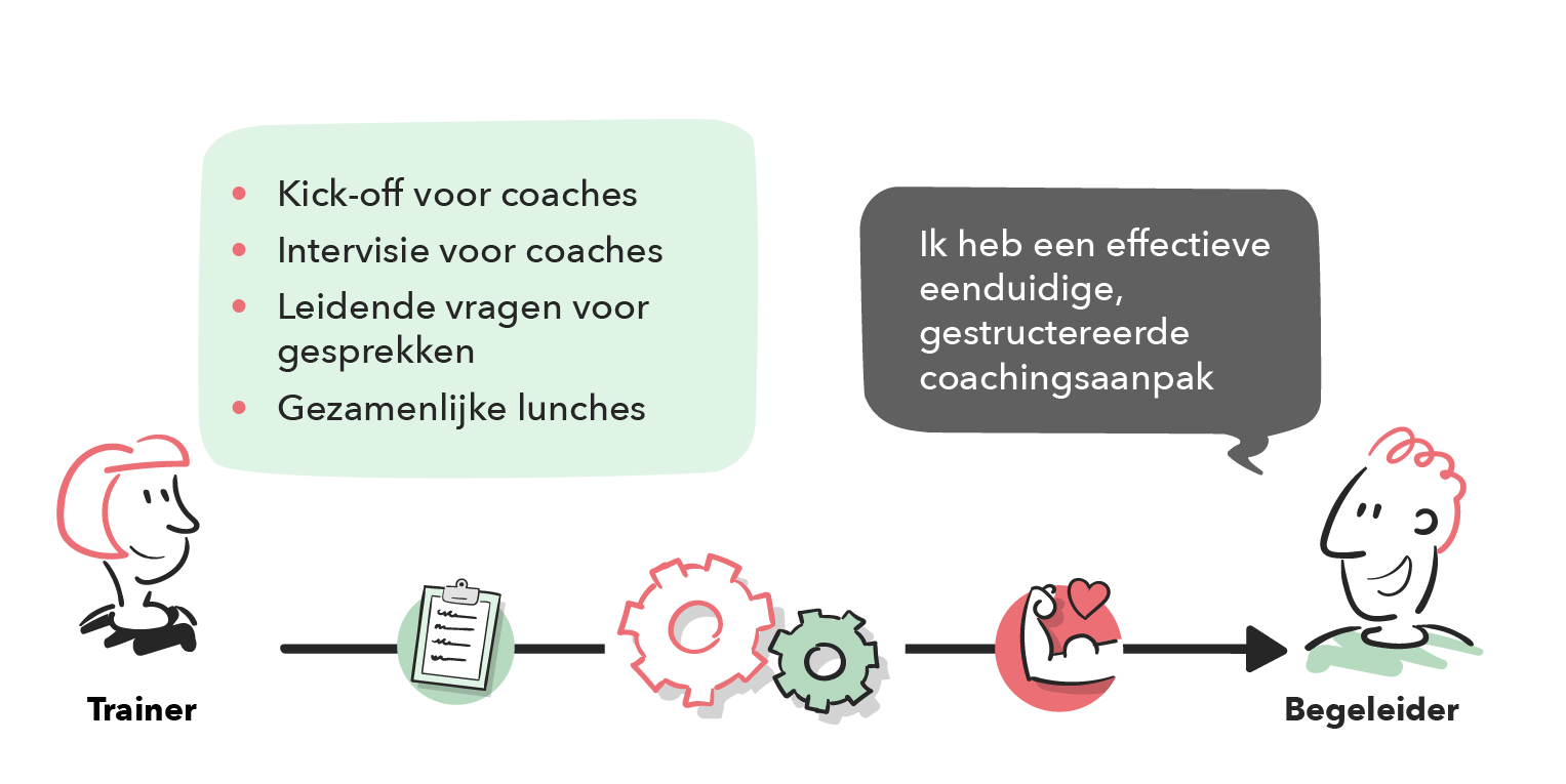 Bij deze aanpak wordt een aantal bijeenkomsten voor carrièrecoaches georganiseerd om studenten beter te kunnen begeleiden. De carrièrecoach, die uit de praktijk komt, wordt ondersteund met een kick-off, intervisiemomenten en leidende vragen voor de sessies. Tijdens deze sessies leren zij coachingsvaardigheden, zoals het stellen van reflectieve vragen, het aannemen van de houding van een neutrale medestander en het geven van feedback. Daarnaast is er ook ruimte voor onderlinge afstemming tussen carrièrecoaches, zodat er geen grote verschillen ontstaan voor studenten. Dit zorgt voor een eenduidige en gestuctureerde coachingsaanpak. De coaches worden samengebracht in een learning community, hierdoor leren ze ook van elkaar en kunnen ze beter met elkaar afstemmen.