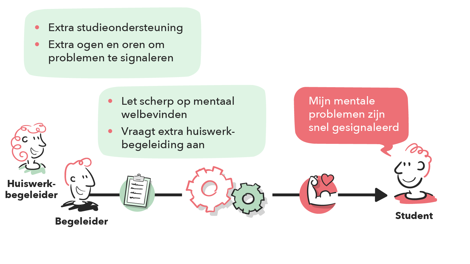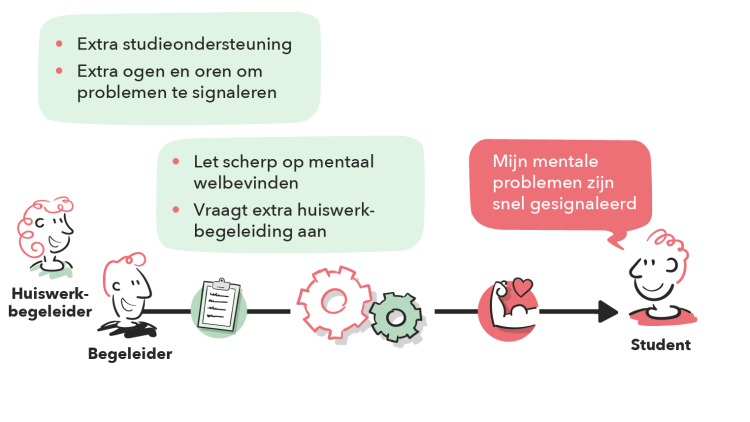 Door de extra slb-uren kan de slb’er extra scherp letten op het mentaal welbevinden van de studenten en extra ondersteuning aanbieden waar nodig. Daarnaast ziet de externe huiswerkbegeleider dit ook als belangrijke taak en speelt hierin een ondersteunende rol. Wanneer de student daar behoefte aan heeft, kan extra studiebegeleiding worden ingezet. Door de aandacht voor mentaal welbevinden, kunnen er in de opleiding eerder mentale problemen gesignaleerd worden en waar nodig, worden doorverwezen zodat de student op tijd hulp ontvangt. Door de bredere aandacht vanuit verschillende hoeken, wordt voorkomen dat mentale klachten escaleren.
