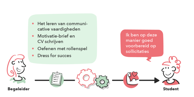De arbeidscoach legt het contact en peilt de behoefte. Tijdens de begeleiding staan de doelen en behoeften van de student centraal. Deze behoeften kunnen uiteenlopen van praktische vragen tot bijvoorbeeld het bieden van een luisterend oor. Daarnaast staat het aantal contactmomenten nog niet op voorhand vast en kunnen zij ook tot ongeveer een half jaar na het afstuderen ondersteuning krijgen van de arbeidscoach. Dit zorgt voor meer binding met de onderwijsinstelling en een soepelere overgang naar werk of een vervolgopleiding. Door deze vraaggerichte aanpak voelt de student zich serieus genomen en wordt hij/zij gezien en gehoord. Bovendien groeit de autonomie van de studenten om zelfstandig keuzes te maken en doordat studenten onderzoeken waar ze ondersteuning bij nodig hebben wordt de reflectie bij studenten ook gestimuleerd.