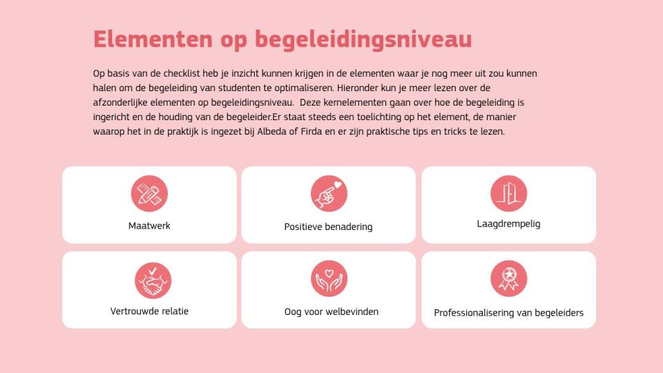 De begeleiding is laagdrempelig. Dit houdt in dat de student bijvoorbeeld gemakkelijk contact kan maken met de begeleider om problemen te bespreken, dat er vaste begeleiders zijn, of dat de begeleiding een vast onderdeel is van de opleiding. Het aanbieden van toegankelijke begeleiding, maakt het makkelijker voor studenten om hulp te zoeken.