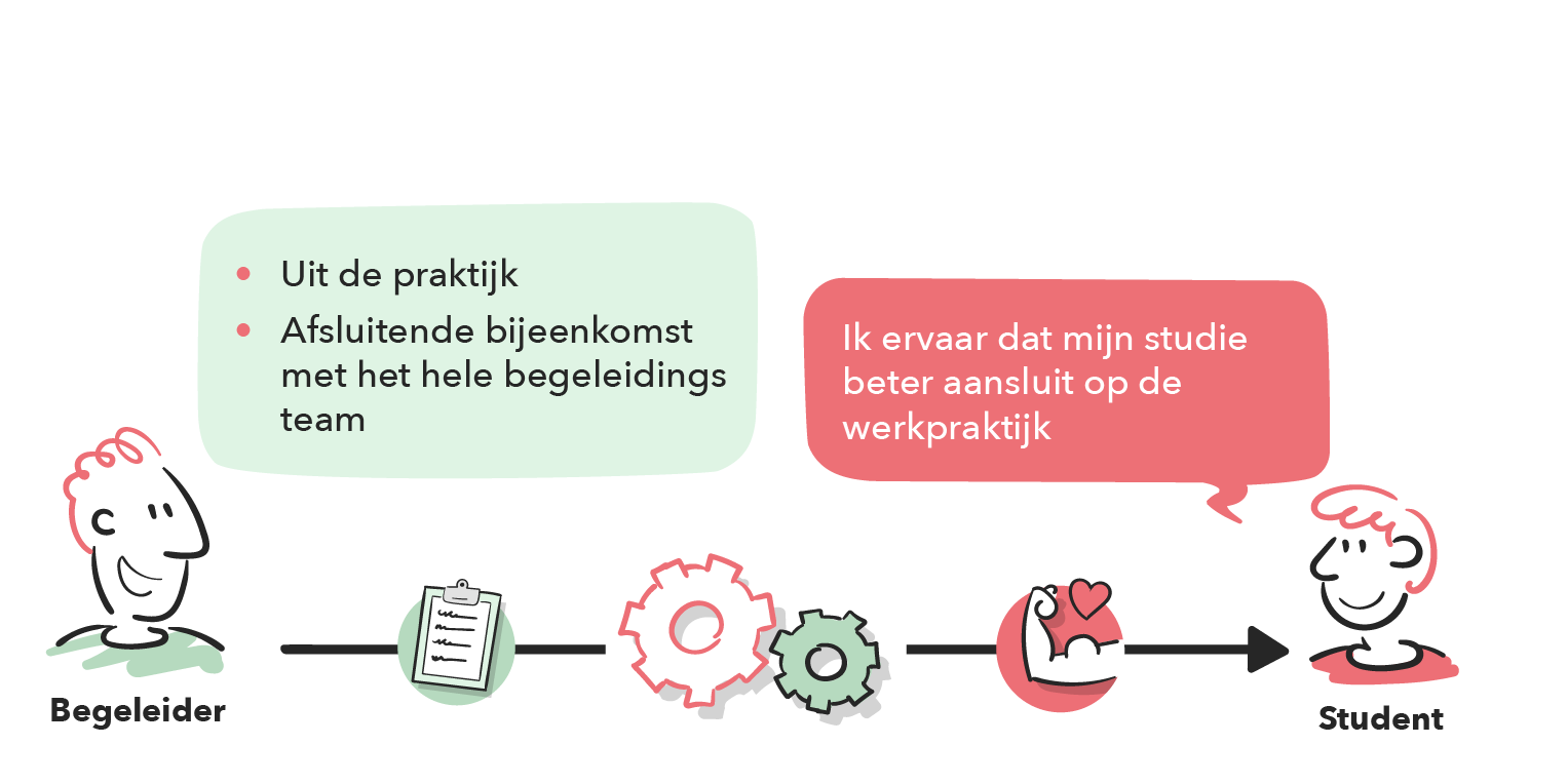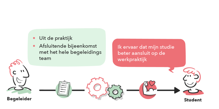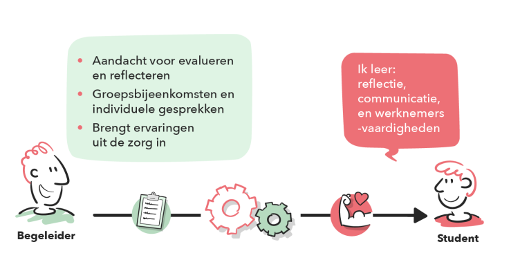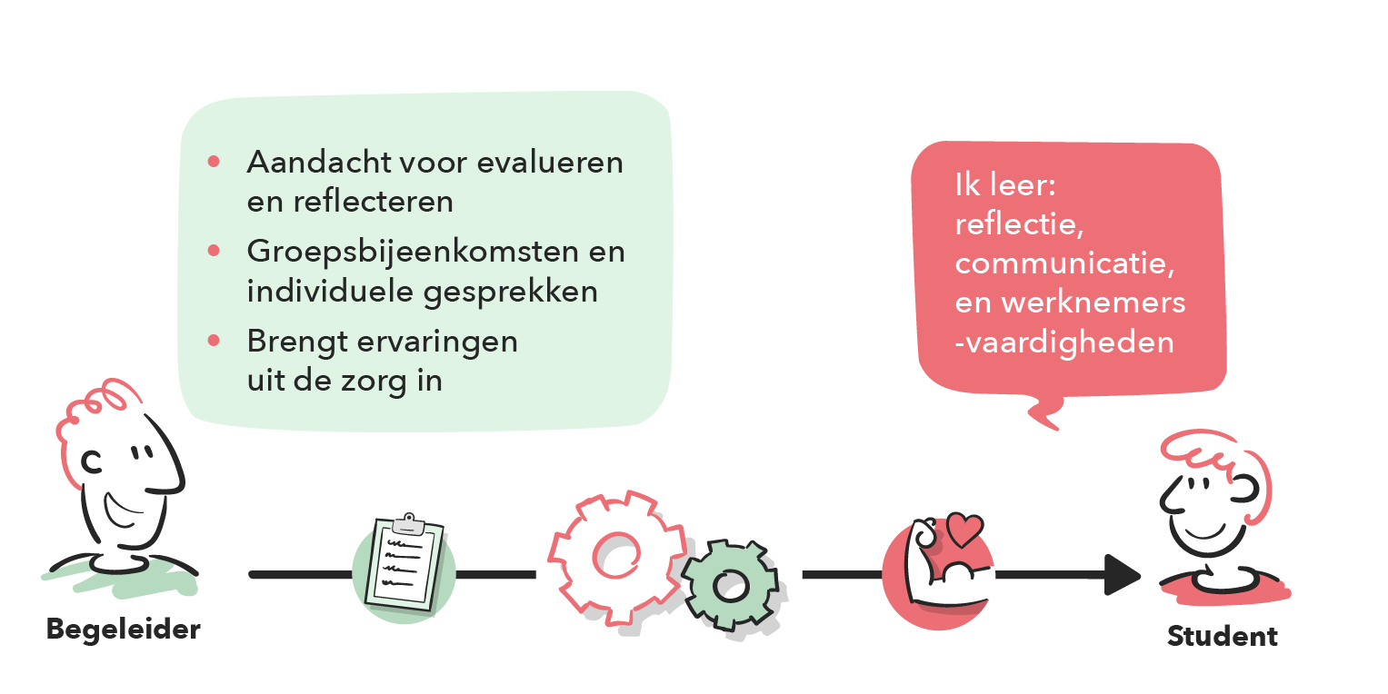 De praktijkexpert spreekt de student op de stage wanneer de student daar behoefte aan heeft. De praktijkexpert begeleidt studenten bij het reflecteren. De focus ligt hierbij op: sterke kanten, eigen gedrag, beslissingen en leerprocessen en dus niet alleen op resultaat. Vragen worden vanuit een motiverende gepreksvoering gesteld zoals: wat ging goed? waarom gingen bepaalde dingen goed of minder goed? De student reflecteert op de stage, dit helpt om bewustwording te vergroten en om een beter beeld te krijgen van de invloed van het eigen gedrag en houding op het leerproces en de stage, zelf regie te nemen en oplossingen te bedenken. Het zelf oplossingen bedenken en keuzes maken versterkt de autonomie, het zelfvertrouwen en de professionele identiteit van de student. Daarnaast helpt de motiverende gespreksvoering en het richten op sterke kanten om een omgeving te creëren waarin studenten zich gesteund voelen, vragen durven te stellen en fouten durven te maken.