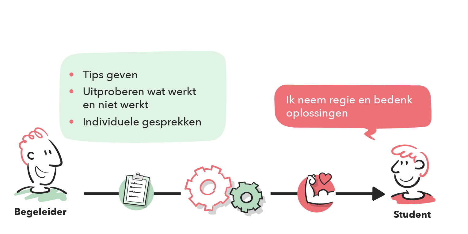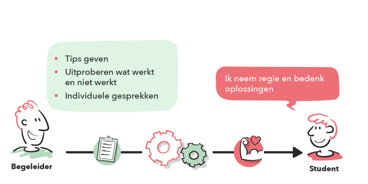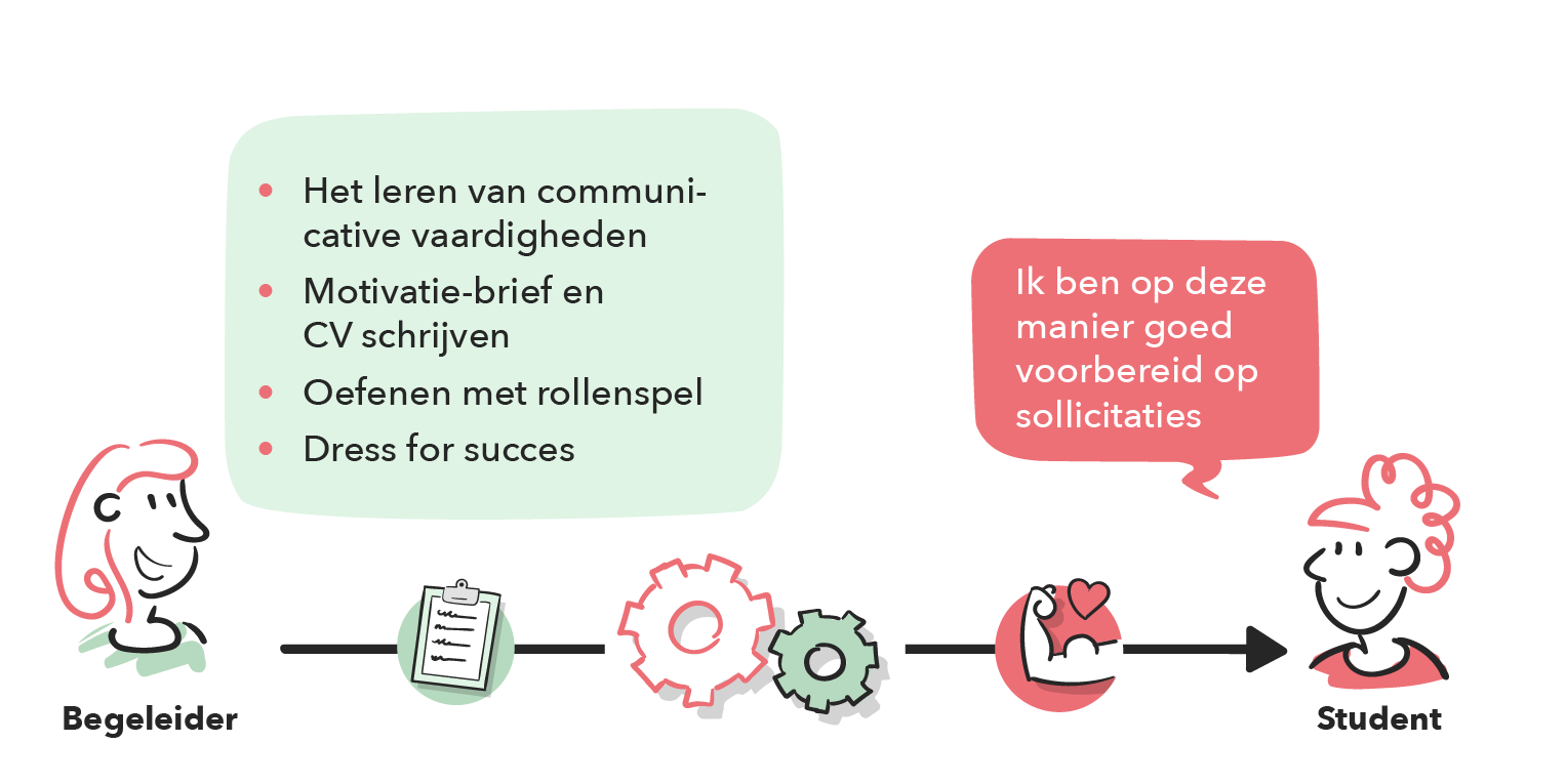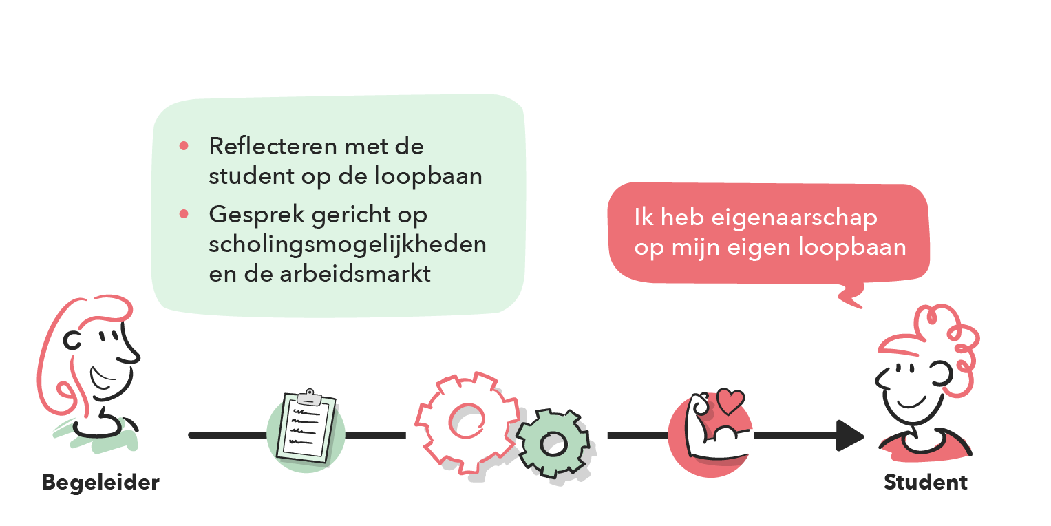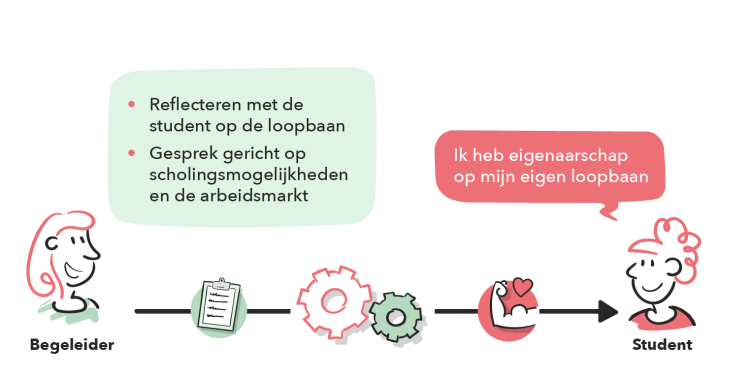 In de sessies kijkt de arbeidscoach samen met de student waar de student tegenaan loopt in de overstap naar werk of een vervolgopleiding. De arbeidscoach stimuleert de student om zelf oplossingen en mogelijkheden te bedenken en om deze ideeën vervolgens in de praktijk te testen. Dit doet de coach door een ondersteunende sfeer te creëren middels uitnodigende taal, zoals 'Wat zou voor jou een eerste kleine stap kunnen zijn?' of 'Hoe zou jij dit willen aanpakken?'. Dit helpt om het denkproces bij studenten te activeren en na te denken over uitdagingen en oplossingen, om vervolgens zelf stappen te zetten. Zo doen studenten praktijkervaring op met hun bedachte oplossingen. Hierdoor leren studenten begrijpen waarom bepaalde vaardigheden en kennis belangrijk zijn en krijgen ze meer inzicht in hun sterke en zwakke punten en ook in hun wensen en mogelijkheden. Door hierin inzicht te krijgen, gaat de student eigenaarschap ervaren over de (school)loopbaan en is beter in staat keuzes te maken over diens toekomst.