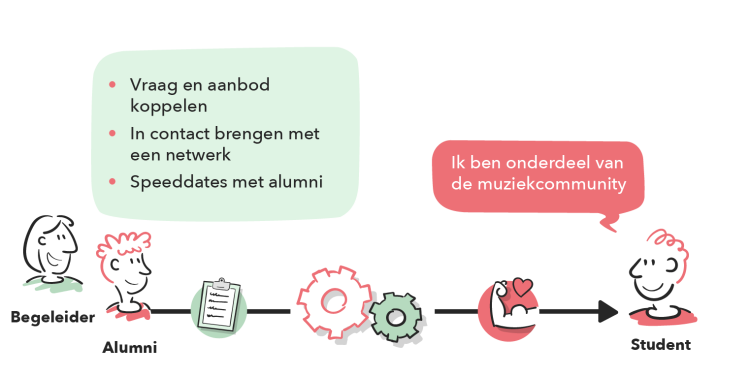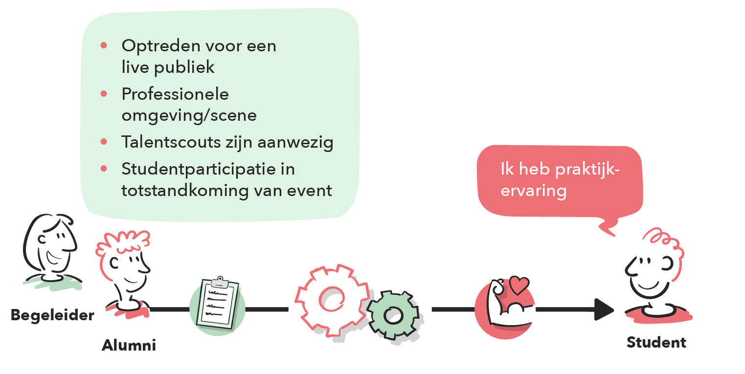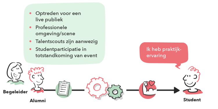 Bij dit voorbeeld wordt door studenten, docenten en alumni een netwerkfestival georganiseerd, waarbij de student optreed op een echt podium voor een publiek en hij/zij oefent in een professionele omgeving. Het oefenen in een professionele omgeving maakt de overstap naar het werkveld makkelijker en zorgt ervoor dat de student succeservaringen opdoet met het optreden. In combinatie met positieve feedback vergroot dit het zelfvertrouwen van de studenten en het gevoel van verbondenheid met het werkveld. Daarnaast hebben studenten de mogelijkheid om professionals te ontmoeten. Door deze ervaringen groeit de student als professional.