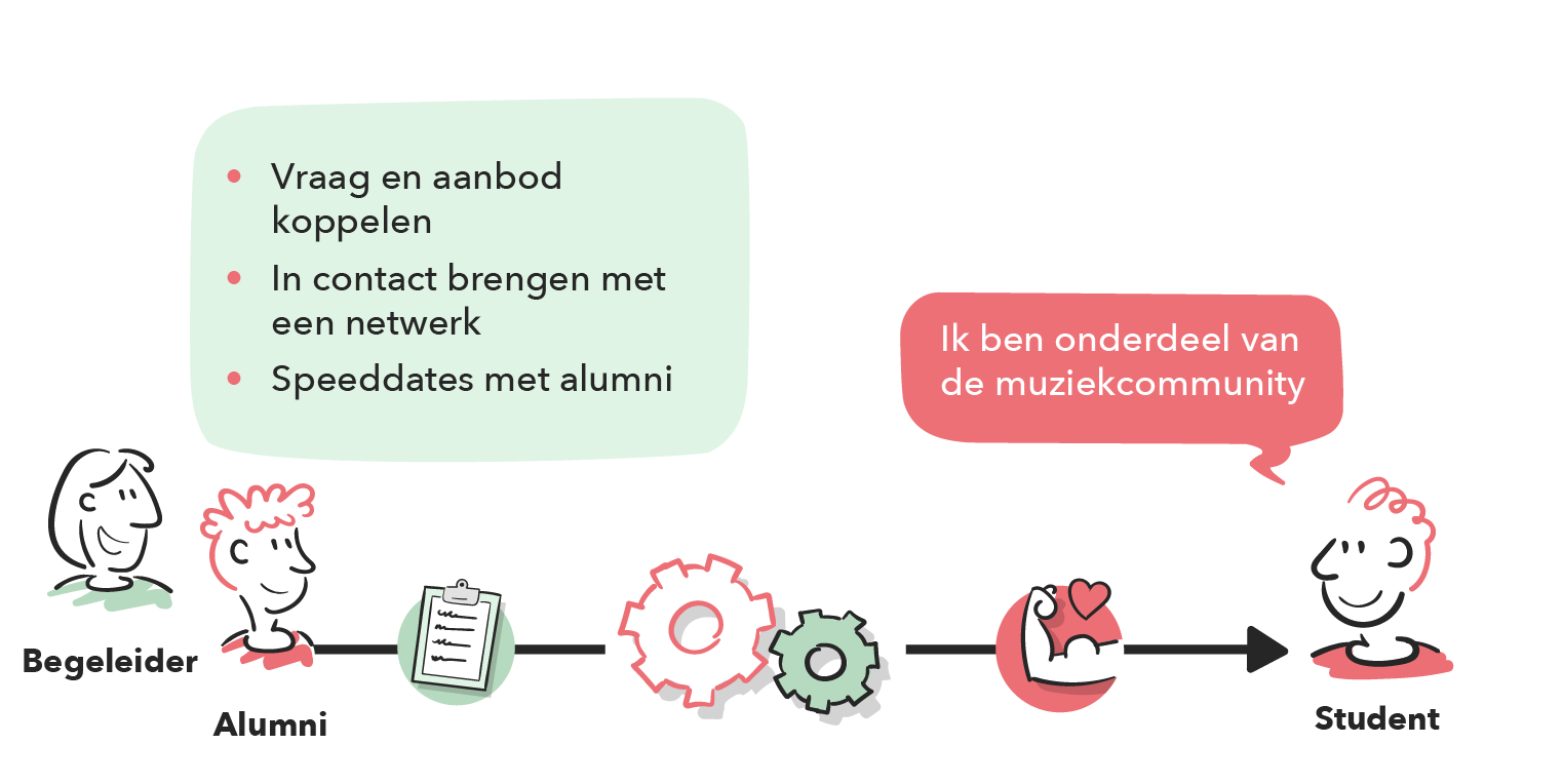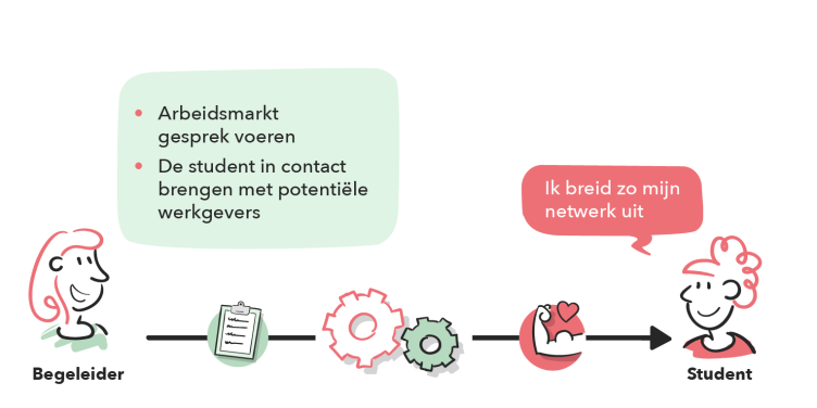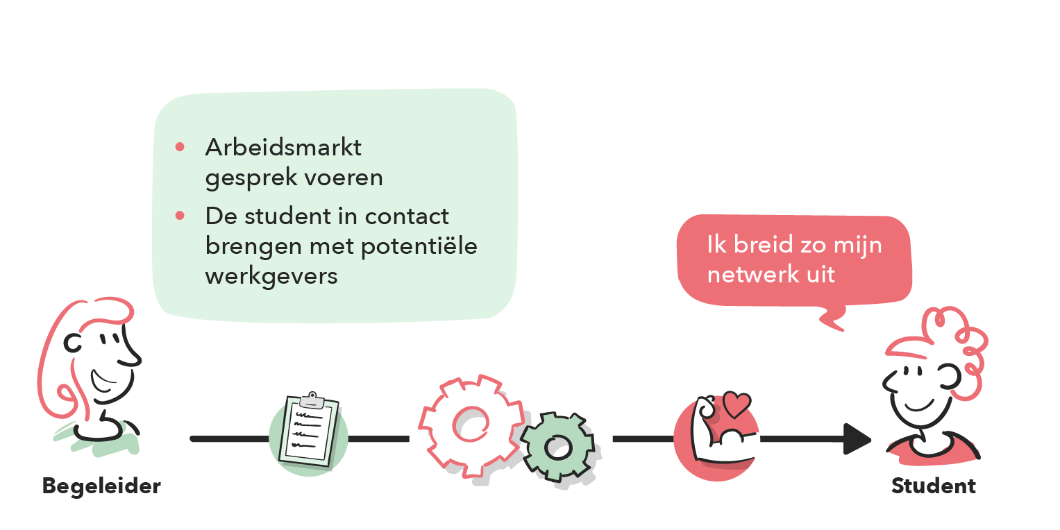In de sessies brengt de arbeidscoach de student in contact met potentiële werkgevers en voert de coach een arbeidsmarkt gesprek. Hierdoor krijgen studenten toegang tot arbeidsmarktinformatie en mogelijkheden om hun netwerk uit te breiden. Ook organiseren de coaches netwerkbijeenkomsten en bieden ze stages en werkervaringsplekken aan om studenten een beter beeld van het werkveld te geven. Doordat de student het werkveld leert kennen, wordt zijn/haar netwerk vergroot. Ook leren studenten meer over concrete mogelijkheden en krijgen ze een beter begrip van de arbeidsmarkt. De persoonlijke begeleiding en expertise uit het netwerk inspireren en motiveren studenten om actief met hun loopbaan aan de slag te gaan. Studenten voelen zich beter voorbereid, hebben toegang tot relevante contacten en weten ze zichzelf te positioneren. Deze begeleiding zorgt voor een soepelere overgang van school naar werk.