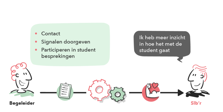 De praktijkexpert is de schakel tussen school (slb’er) en stage (werkbegeleider). De verantwoordelijkheid voor de begeleiding is daarmee verdeelt. De praktijkexpert observeert de student op de werkvloer, geeft praktijkgerichte feedback en volgt de leerontwikkeling. De werkbegeleider blijft verantwoordelijk voor de dagelijkse begeleiding op de stageplek en de slb’er coördineert de voortgang van de student vanuit de opleiding, bewaakt dat de leerdoelen van de stage aansluiten op het bredere studieprogramma en biedt ondersteuning bij problemen. De praktijkexpert heeft zowel regelmatig contact met de werkbegeleider als met de slb’er en samen maken ze heldere afspraken over verantwoordelijkheden. Dit zorgt voor een nauwe samenwerking tussen school en stage en voor afgestemde, consistente begeleiding voor de student. Door deze afgestemde begeleiding/bijsturing vanuit verschillende perspectieven, is er op school beter zicht op hoe het met de student gaat en weet de student ook beter wat er verwacht wordt en voelt die zich gesteund in diens ontwikkeling.