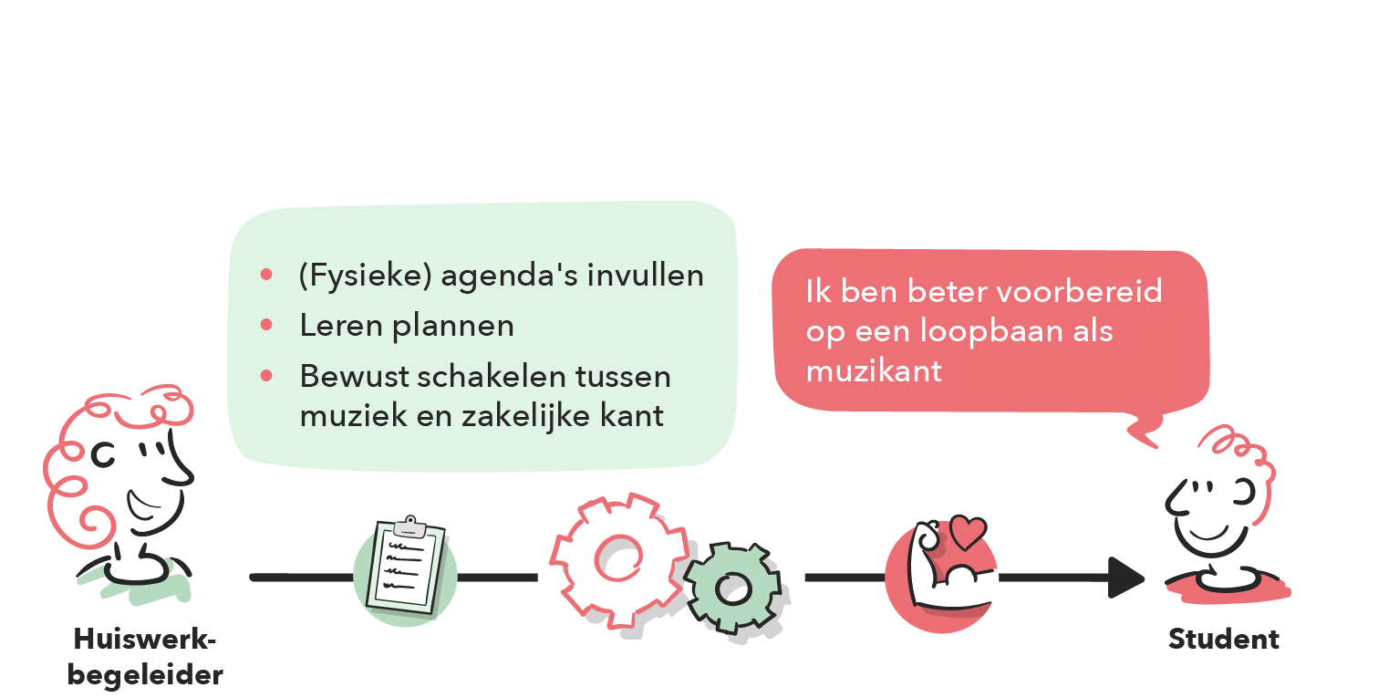 De externe huiswerkbegeleider ondersteunt studenten bij het ontwikkelen van leerstrategieën en helpt hen bij het plannen en organiseren van hun schoolwerk. Zo helpt de begeleider, de studenten met het gebruiken van fysieke planners of agenda's om hun activiteiten te organiseren. Doordat de student leert schakelen tussen creatieve modus (bijvoorbeeld muziekproductie) en ‘zakelijke’ modus, ontwikkelt hij/zij belangrijke zakelijke vaardigheden, zoals plannings- en organisatievaardigheden die nodig zijn als professional.