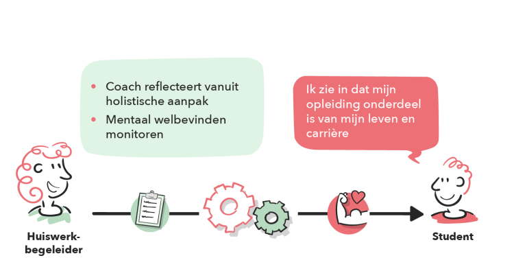 De externe huiswerkbegeleider houdt individuele reflectiegesprekken met studenten wanneer zij hier zelf behoefte aan hebben of wanneer de slb’er merkt dat de studievoortgang in gevaar komt. Tijdens deze gesprekken reflecteert de huiswerkbegeleider op een holistische manier met de student waar de studieproblemen vandaan komen en kunnen studenten persoonlijke problemen aankaarten. Het externe bureau biedt brede ondersteuning, zoals inhoudelijke begeleiding, leren leren en omgaan met motivatie en stress. Doordat het bureau extern is, kunnen de begeleiders helpen om vanuit een breder perspectief dan alleen vanuit het perspectief van de opleiding te reflecteren. Doordat de student zijn/haar wensen en behoeften leert kennen, ziet hij/zij in dat de opleiding een onderdeel is van hun professionele en persoonlijke ontwikkeling en kan het hen helpen om in te zien waar ze het beste prioriteiten kunnen leggen en om studeerproblemen aan te pakken.