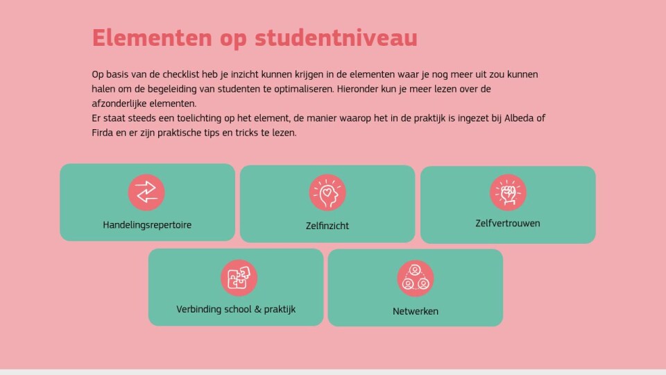 Er staat steeds een toelichting op het element, de manier waarop het in de praktijk is ingezet bij Albeda of Firda en er zijn praktische tips en tricks te lezen.