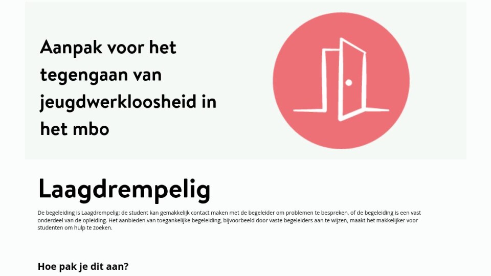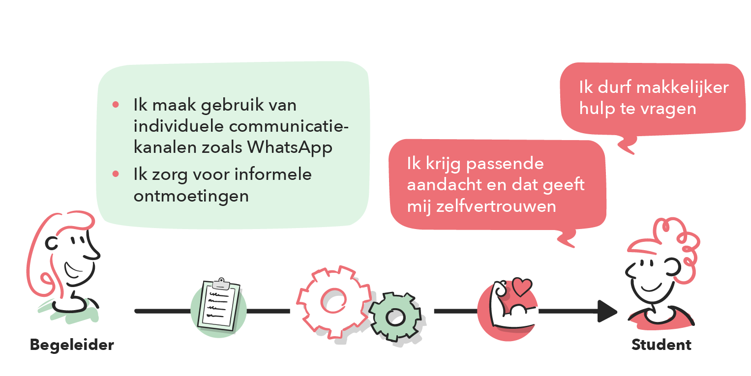 De begeleiding is Laagdrempelig: de student kan gemakkelijk contact maken met de begeleider om problemen te bespreken, of de begeleiding is een vast onderdeel van de opleiding. Het aanbieden van toegankelijke begeleiding, bijvoorbeeld door vaste begeleiders aan te wijzen, maakt het makkelijker voor studenten om hulp te zoeken.