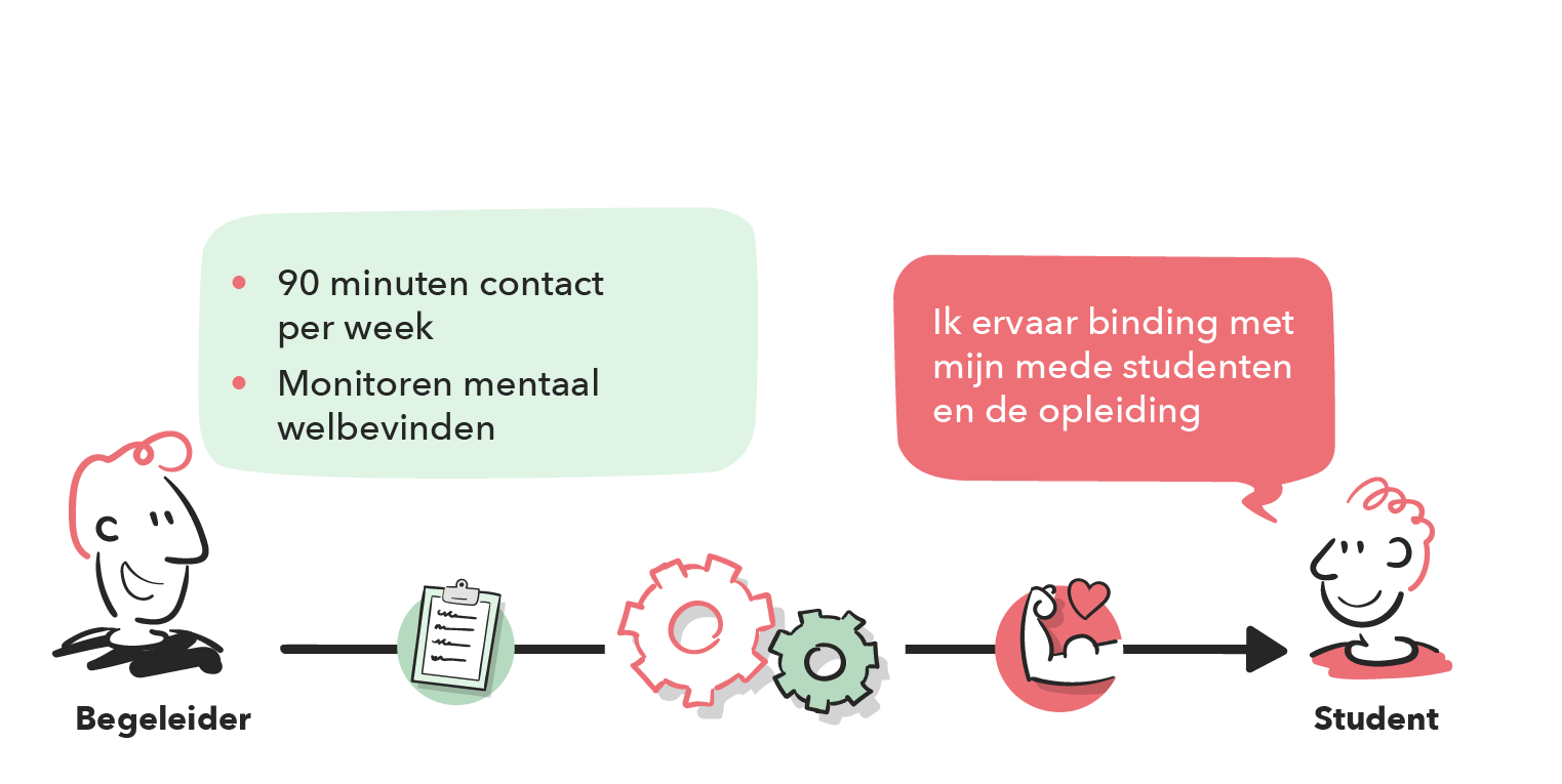 De student krijgt extra slb-uren (groep of individueel) als onderdeel van de opleiding. Doordat de student ervaringen kan delen en bij andere studenten kan herkennen, voelt de student zich verbonden met de opleiding, serieus genomen en dat hij/zij gezien en gehoord wordt.