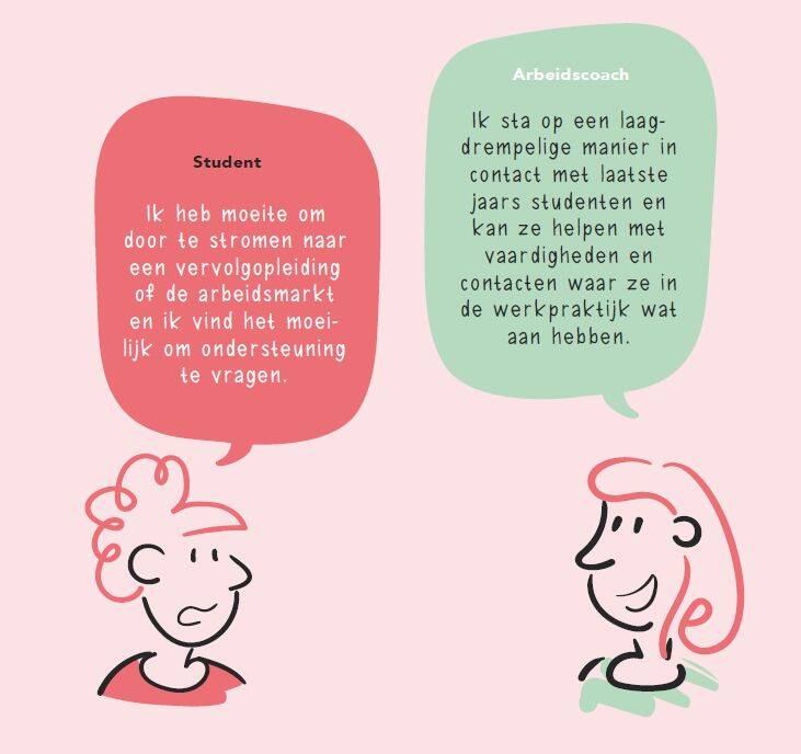 De arbeidscoach legt het contact en peilt de behoefte. Door deze vraaggerichte aanpak voelt de student zich serieus genomen en wordt hij/zij gezien en gehoord.