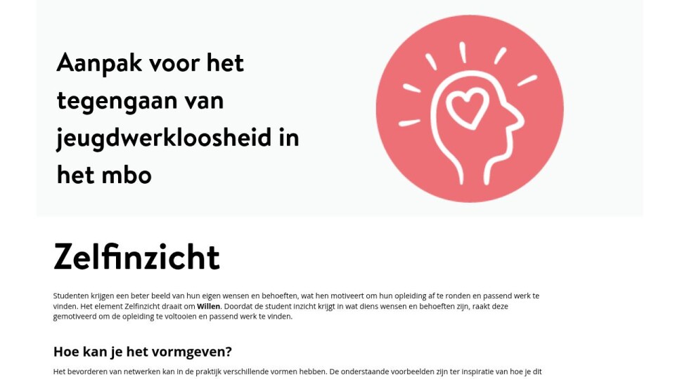 Studenten krijgen een beter beeld van hun eigen wensen en behoeften, wat hen motiveert om hun opleiding af te ronden en passend werk te vinden. Het element Zelfinzicht draait om Willen. Doordat de student inzicht krijgt in wat diens wensen en behoeften zijn, raakt deze gemotiveerd om de opleiding te voltooien en passend werk te vinden.